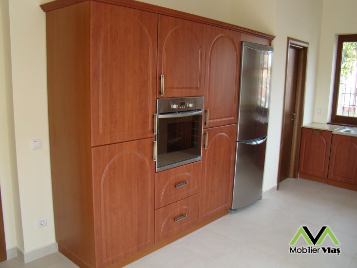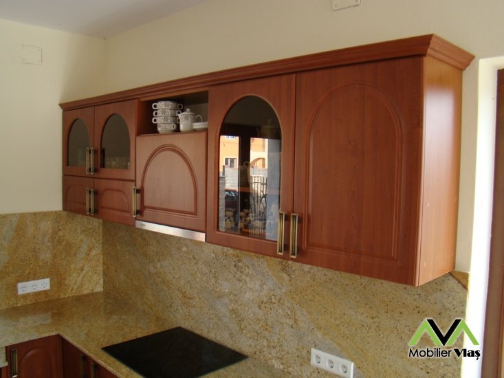 DetaliiMobilier cu usi din mdf cu profil rustic.Mobilierul se realizeaza la comanda in functie de cerintele clientului(Dimensiuni,Nuante Pal,Accesorii) din Pal Melaminat 18 mm. Accesorii de cea mai buna calitate.Cant ABS de 2mm si 0,5mm.Usi sticla transparenta, glisiere cu extractie totala, manere metalice, picurator vase.