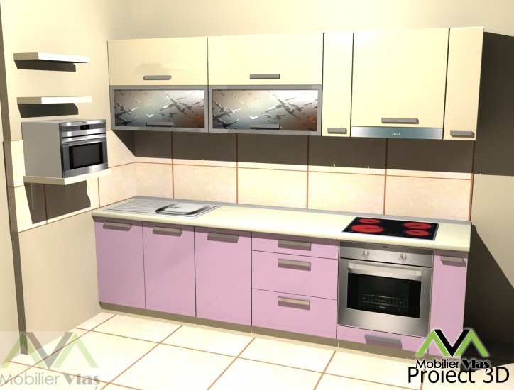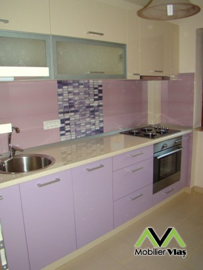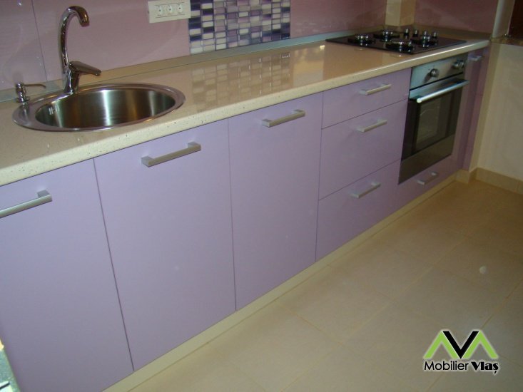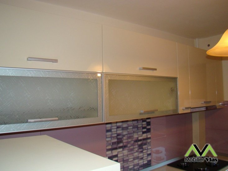 DetaliiMobila de bucatarie cu usi din mdf lucios,carcase pal,usi sticla cu rame de aluminiu,telescoape amortizare,suport tacamuri,picurator vase,cos gunoi,dozator sapun. Mobilierul se realizeaza la comanda in functie de cerintele clientului(Dimensiuni,Nuante Pal,Accesorii) din Pal Melaminat 18 mm. Accesorii de cea mai buna calitate.Cant ABS de 2mm si 0,5mm