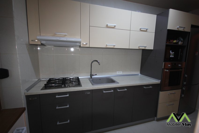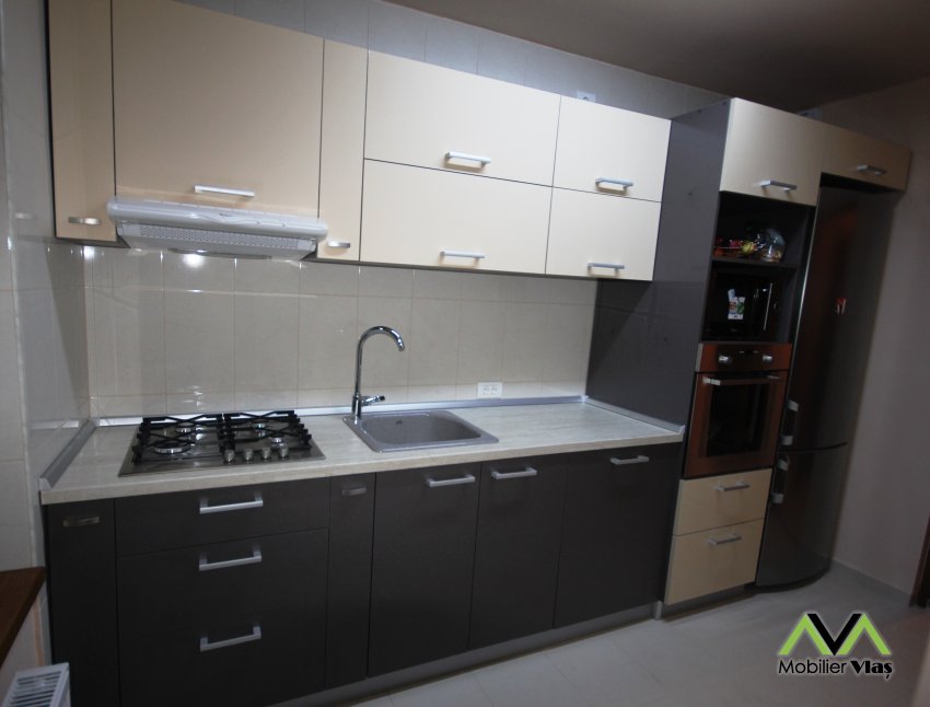 DetaliiMobila realizata din pal melaminat ciocolata cu fronturi de usi si sertare din mdf crem lucios.