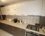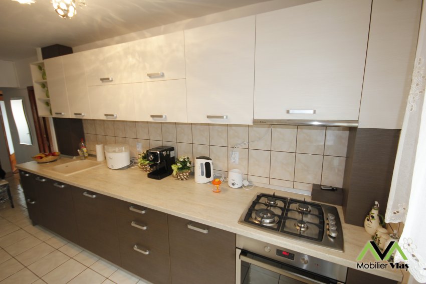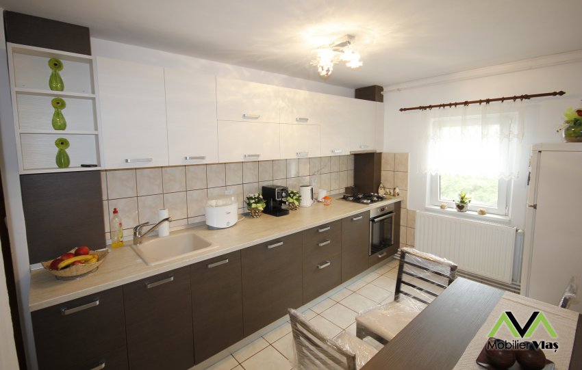 DetaliiMobila realizata din pal melaminat Egger, decor woodline crem si woodline mocca, blat tibur, manere Hafele, sertare metalice Blum, balamale cu amortizare Blum, sistem de ridicare usa Aventor HF-Blum, scurgator de vase in sertar, chiuveta din granit la culoarea blatului, masa din pal melaminat decor woodline mocca si scaune in aceeasi nuanta cu sezut crem imitatie de piele.
