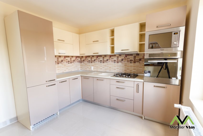 DetaliiMobila realizata din pal melaminat Egger de 18 mm cu front de mdf lucios Nett Front, sisteme de ridicare usi Blum, balamale cu amortizare Blum, sertare metalice Blum Tandembox Antaro, manere Hafele, scurgator de vase Hafele, suport tacamuri, cos jolly SCH, chiuveta Fat din granit la culoarea blatului, electrocasnice Hotpoint.