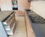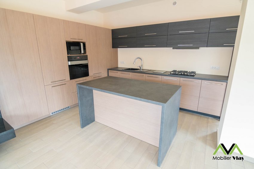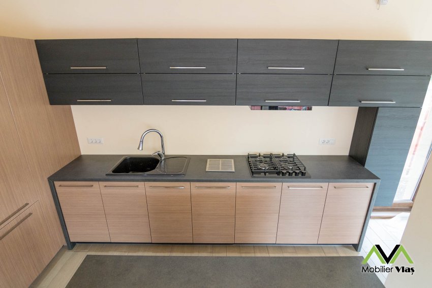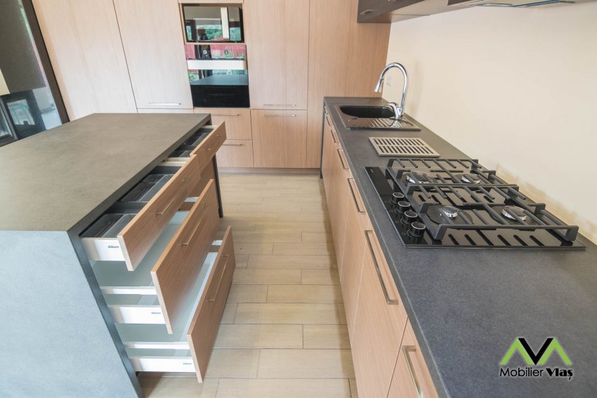 DetaliiMobilier cu fronturi din Mdf, sertare metalice Blum, siteme de ridicare usi Blum, balamale amortizare Blum, manere metalice Hafele