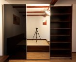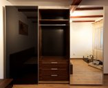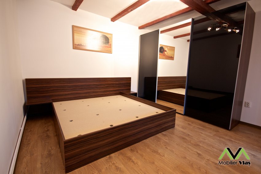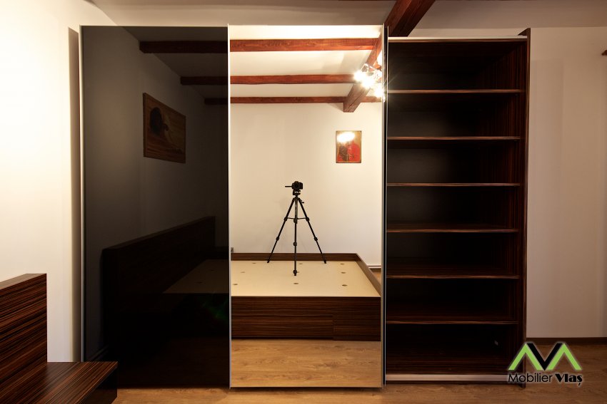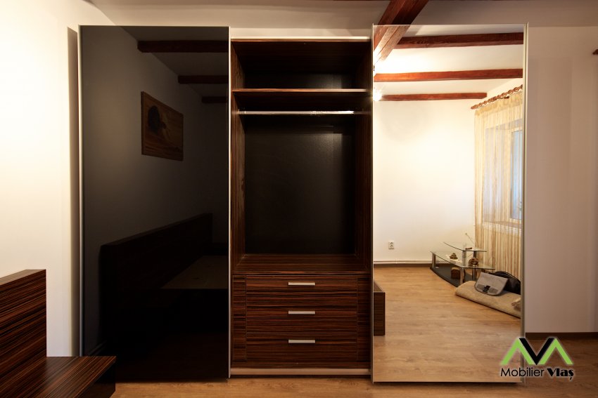 DetaliiMobila realizata din pal melaminat Egger, decor Makassar si fronturi din MDF negru lucios. Pentru dulap s-a folosit sistem de glisare Hafele - Master cu amortizare.