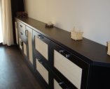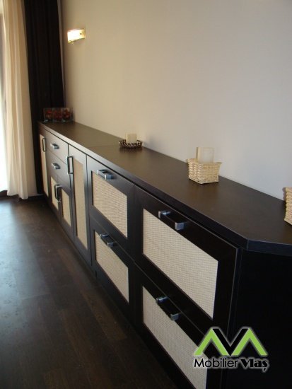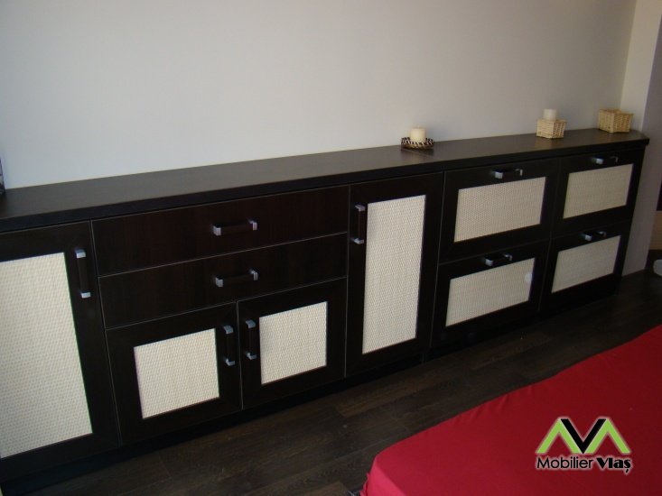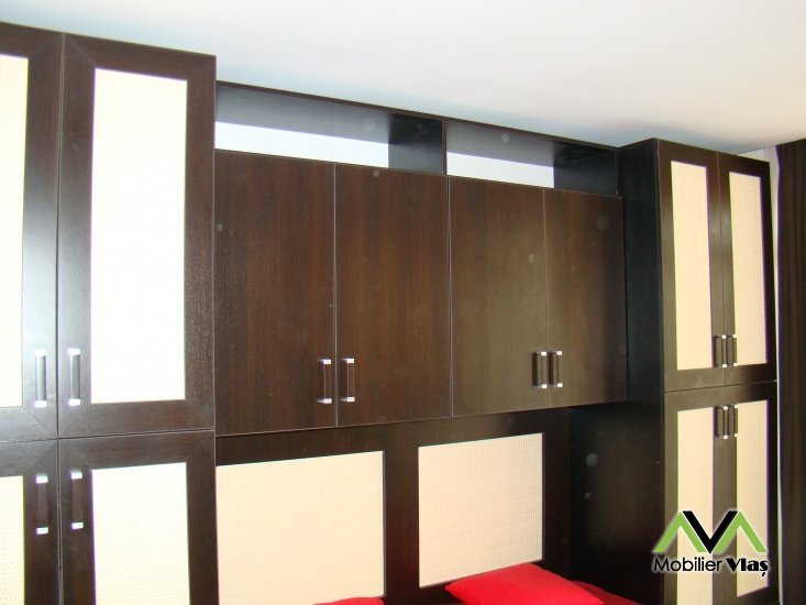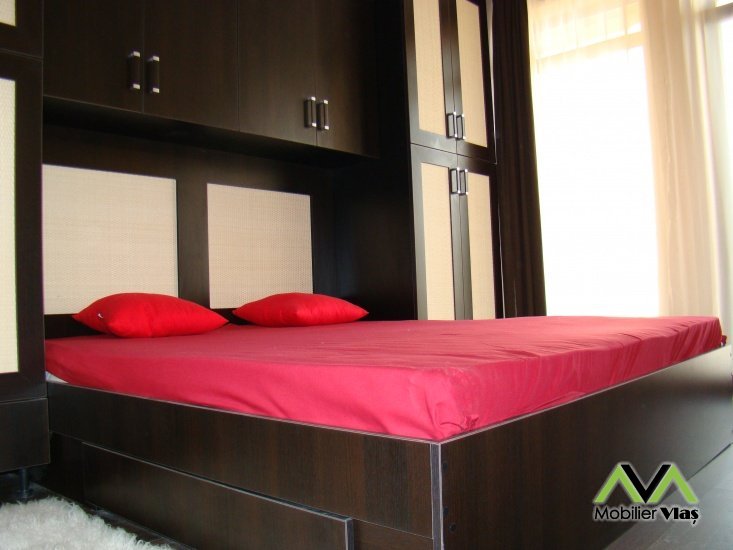 DetaliiMobilier cu usi rama pal cu ratan.Pat cu sertar.Mobilierul se realizeaza la comanda in functie de cerintele clientului(Dimensiuni,Nuante Pal,Accesorii) din Pal Melaminat 18 mm. Accesorii de cea mai buna calitate.Cant ABS de 2mm si 0,5mmGlisiere cu extractie totala pe bila la sertare.Picioare Reglabile. Manere plastic wenge.
